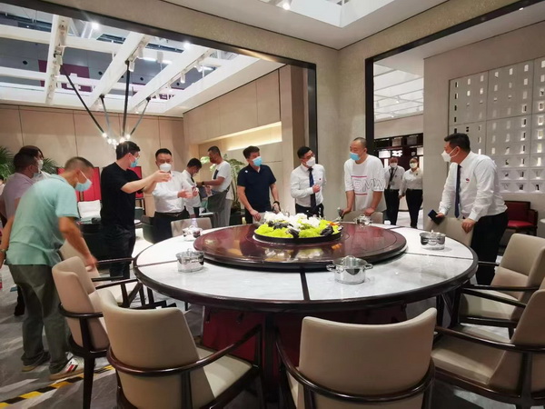 中国传统工艺大师、中国家具协会副理事长、东成红木董事长张锡复(中)携公司管理团队齐聚一堂,共同为活动宣传造势