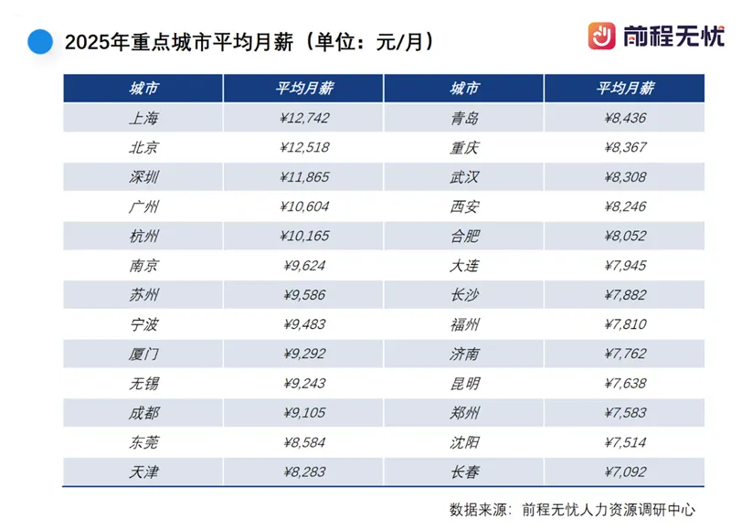 高薪岗位扎堆,平均薪资自然不低。人力资源服务商前程无忧51job发布的最新一期《人力资源白皮书》显示,在2025年全国重点城市月薪统计排名中,北上广深杭平均月薪均超1万元。