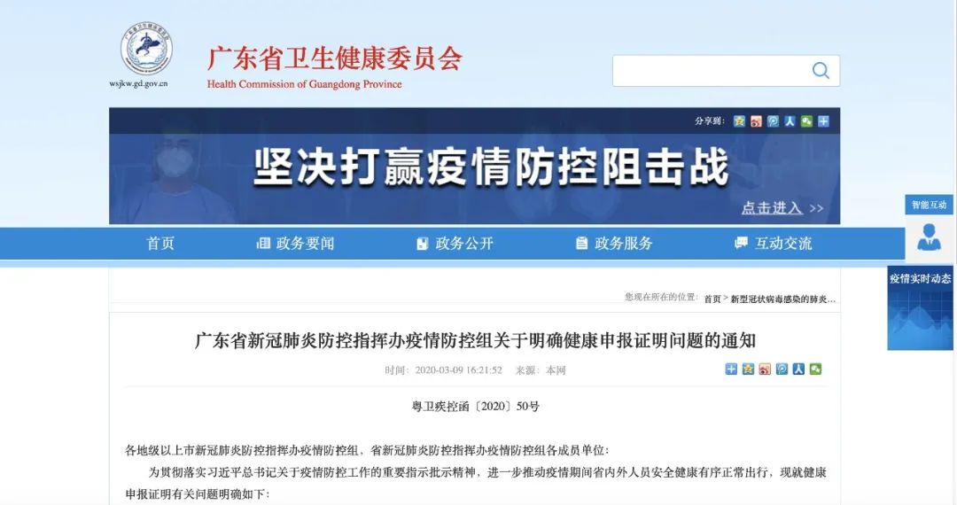 广东省新冠肺炎防控指挥办疫情防控组关于明确健康申报证明问题的通知