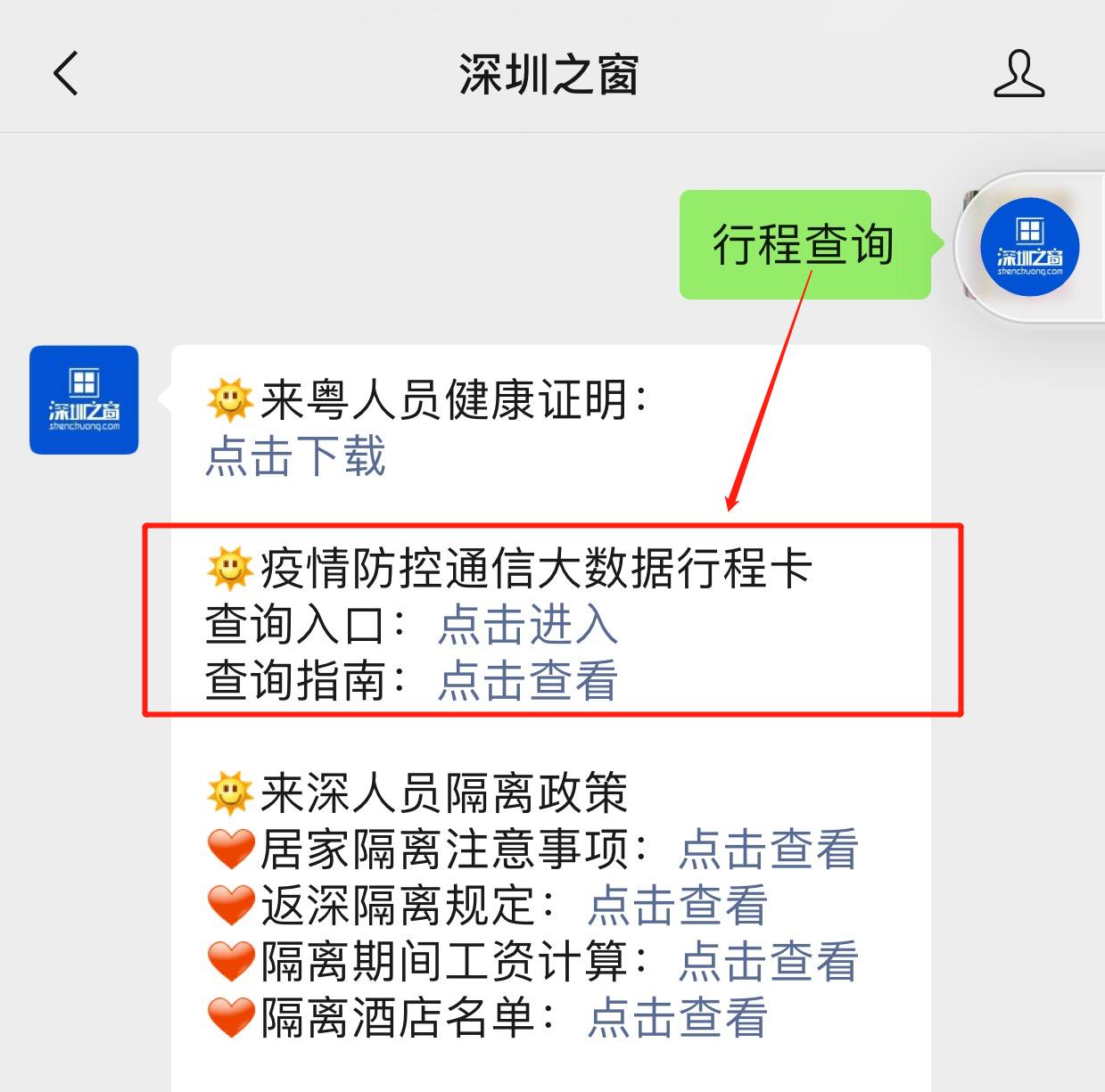 微信搜索关注【深圳之窗】公众号,对话框发送关键词【行程查询】,即可获取个人轨迹信息查询。