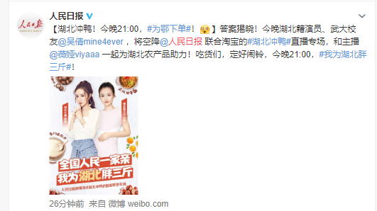 4月13日21:00,人民日报新媒体联合@淘宝 ,共同发起#湖北冲鸭#直播专场。知名主播@薇娅viyaaa 将和神秘嘉宾一起为湖北农产品助力,就在@人民日报 !全国的吃货们,准时围观,#我为湖北胖三斤#!