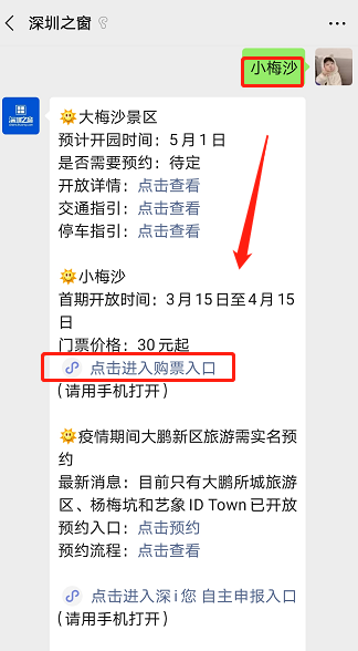 微信搜索或扫描文末二维码,关注【深圳之窗】公众号,对话框发送关键词【小梅沙】即可进入购票入口。