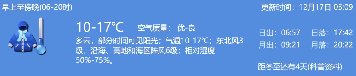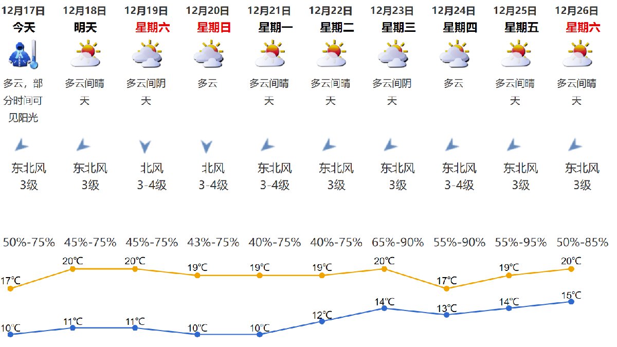 17-18日多云到晴天,气温小幅回升,早晚仍寒冷,沿海、高地和海区最大阵风6级;19-21日冷空气补充影响,最低气温再次下降到10℃左右。深圳市气象台12月17日 05:09发布。