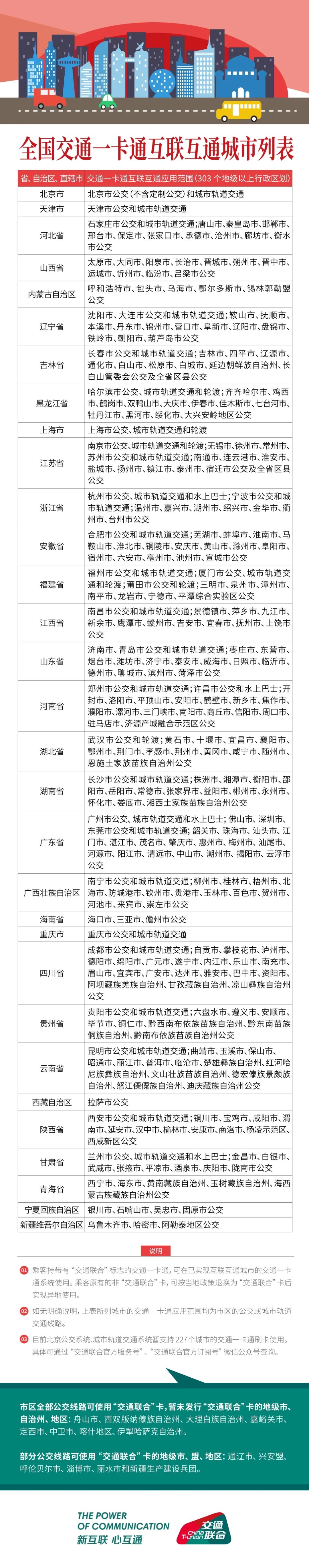 2021年1月7日,交通联合官方发布2020年全国交通一卡通互联互通最新应用范围,最新的全国交通一卡通互联互通城市列表。截至2020年12月底,全国已实现303个地级以上城市交通一卡通互联互通。