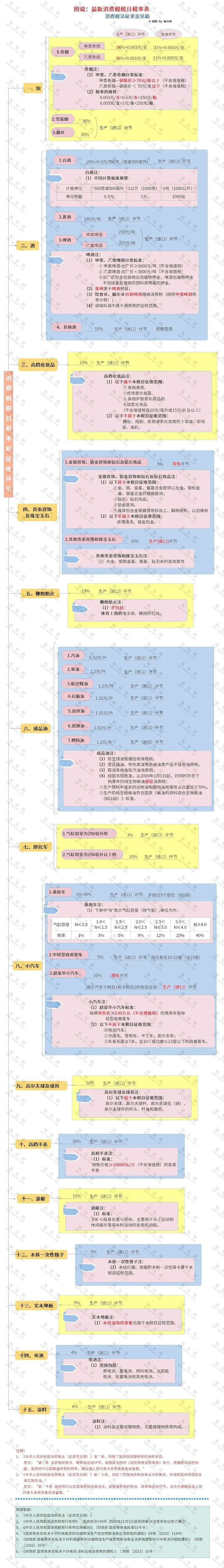 消费税是对特殊的消费品在生产、批发、零售环节征收的税费。消费税的税率较繁杂,如下图所示。