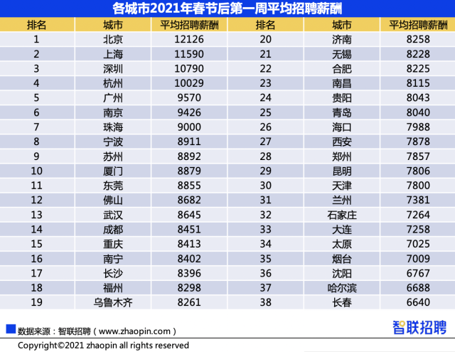 节后复工第一周,全国38个核心城市平均招聘薪酬为8993元/月。分行业来看,基金/证券/期货/投资行业的平均招聘薪酬达12271元/月,位居行业之首。北京以12126元/月的薪酬排行全国第一,薪酬过万的城市还有上海(11590元/月)、深圳(10790元/月)与杭州(10029元/月)。