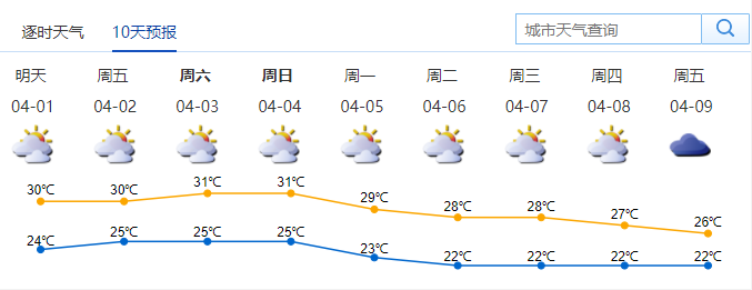 深圳市气象台预计,4月1日多云,早晚有轻雾,沿海、高地和海区阵风6级左右,中午前后体感热;2-5日清明假期多云间晴天。