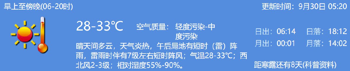 9月30日深圳天气晴天间多云,天气炎热,午后局地有短时(雷)阵雨,雷雨时伴有7级左右短时阵风;气温28-33℃;西北风2-3级;相对湿度55%-90%。
