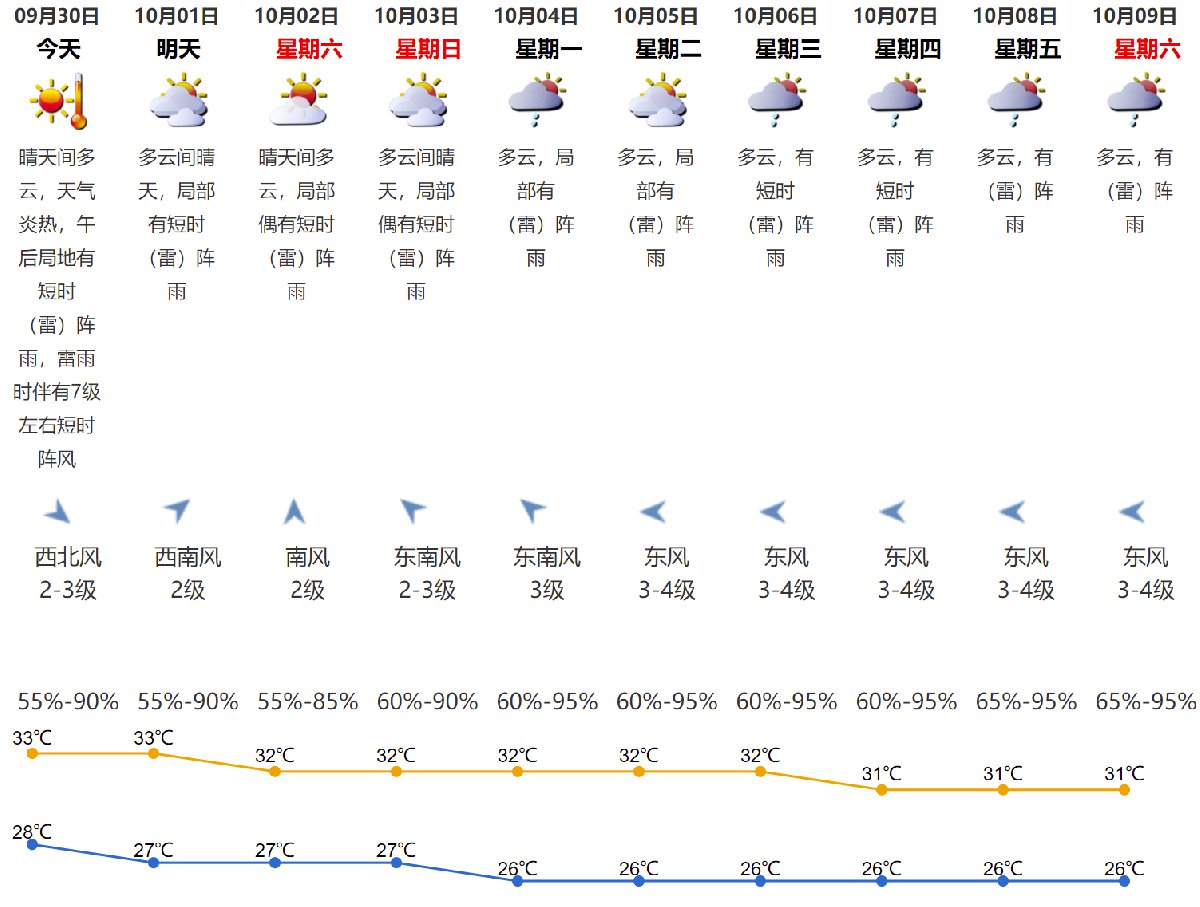 9月30日至10月1日晴天到多云,天气炎热,午后局地有短时热雷雨,部分时间有轻微到轻度霾;2-3日多云间晴天,局地偶有短时(雷)阵雨;4-7日偏东气流加强,多云,间中有短时(雷)阵雨,沿海、高地和海区最大阵风可达6-7级。深圳市气象台9月30日 05:20发布。