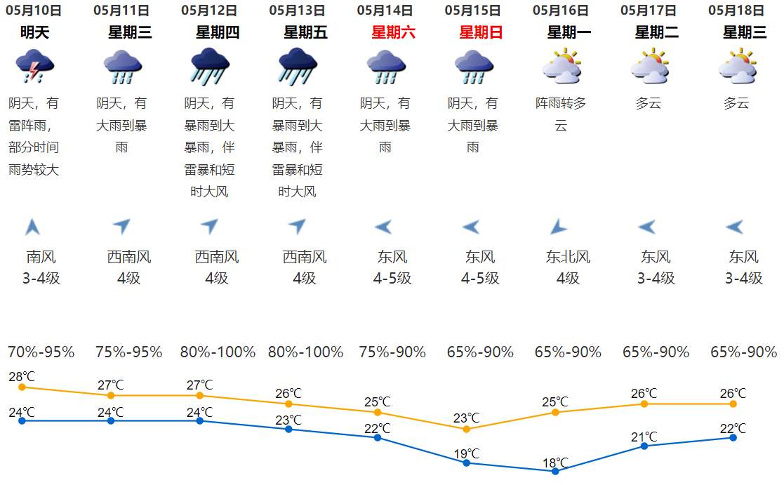 10日阴天有雷阵雨,部分时间雨势较大;11-13日我市有一次持续性暴雨过程,并伴有雷暴大风,其中11日有大雨到暴雨,12-13日有暴雨到大暴雨;14-15日仍有暴雨,气温下降,体感阴凉;16日白天起气温回升。深圳市气象台5月9日 10:28发布。
