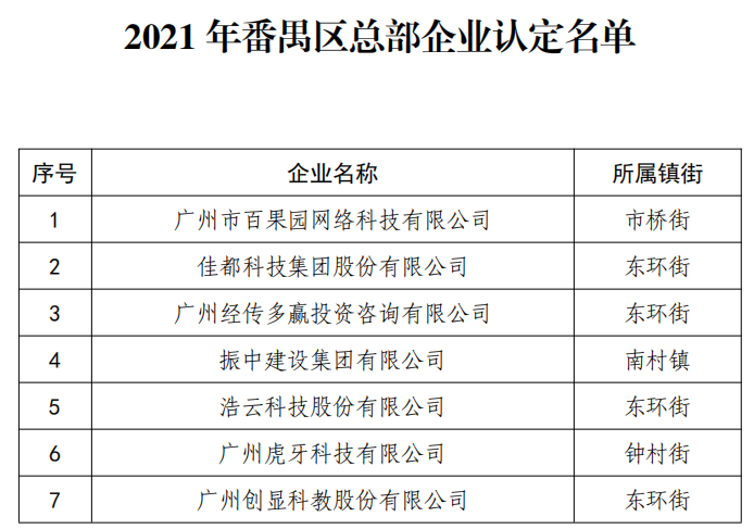 此次总部企业认定中,广州市政府综合营业收入、纳税额、经济社会贡献、企业自主创新、技术改造、品牌创建、开拓市场、人才培育等多方面,最终番禺区只有七家企业入选,包括经传多赢、虎牙科技、浩云科技、百果园、创显科教等各领域优秀企业。