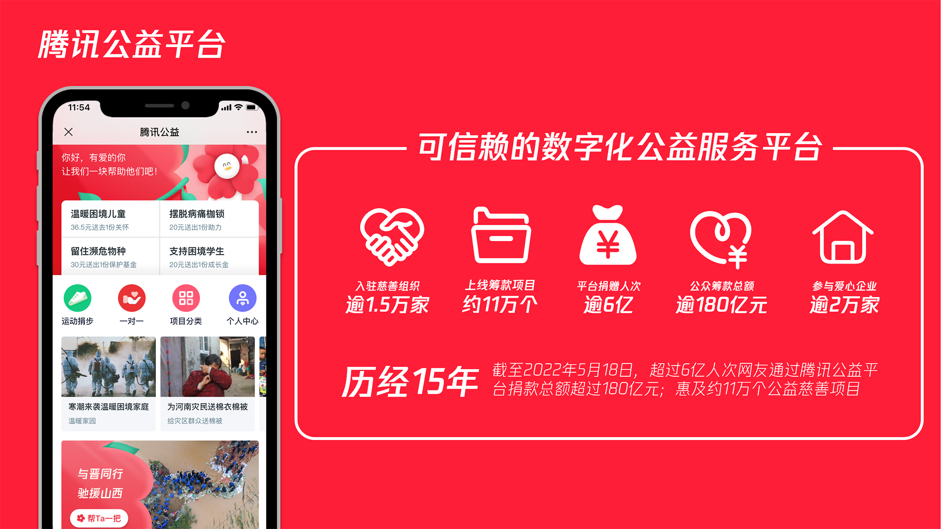 不仅如此,腾讯公益平台也将致力于公益项目成长体系的构建。得益于平台上已累计的11万个公益项目,腾讯公益将通过数字化的分析,为更多优质公益项目搭好“台子”,让大众更广泛、更深度地参与其中。在刘琴看来,“服务”的理念可以给互联网公益带来更多空间,让公益变得可持续。