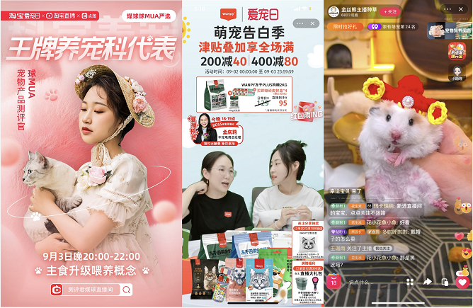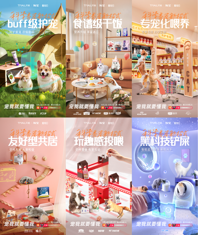 据了解,9月2-3日,天猫淘宝宠物举办了首场品类整合大促“爱宠日”,围绕“科学养宠”理念,结合阿里巴巴大数据,推出6大细分品类趋势赛道,分别为:【满足宠物营养升级的食谱级干饭】、【专宠专用的专宠化喂养】、【营造玩趣感投喂的互动零食】、【建立buff级护宠的保健药品】、【监测爱宠健康状况的黑科技铲屎】和【打造人宠和谐共居的友好型家居】,并通过站内外导购及种草全链路联动,以场景化、内容化等形式强化科学养宠心智。