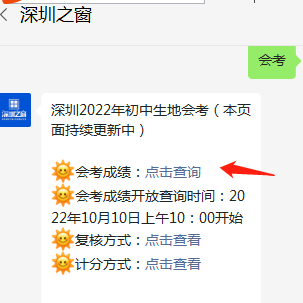 微信搜索并关注【深圳之窗】公众号 ,发送【会考】即可获取2022深圳初中会考成绩手机查询入口及相关政策等。