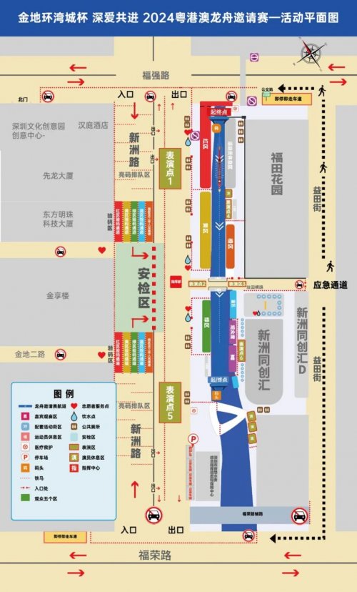 福田新洲河龙舟赛共分为“红、黄、绿、橙、蓝”观众区域,实行分区预约,观众根据自己的预约,到指定区域观赛。