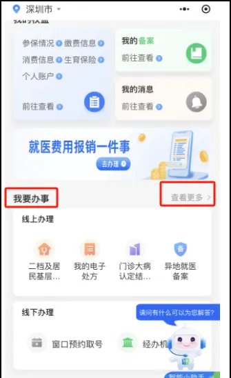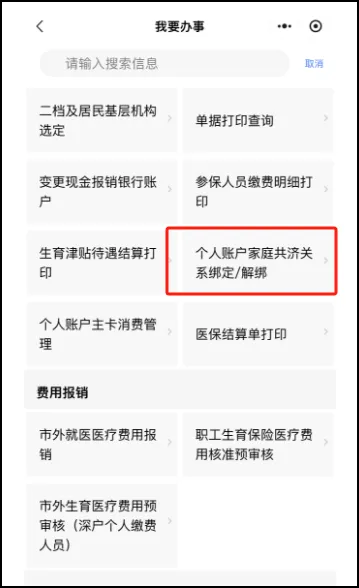 1.界面找到【我要办事】模块,点击【查看更多】。界面下滑点击【个人账户家庭共济关系绑定/解绑】功能,进入业务办理界面。