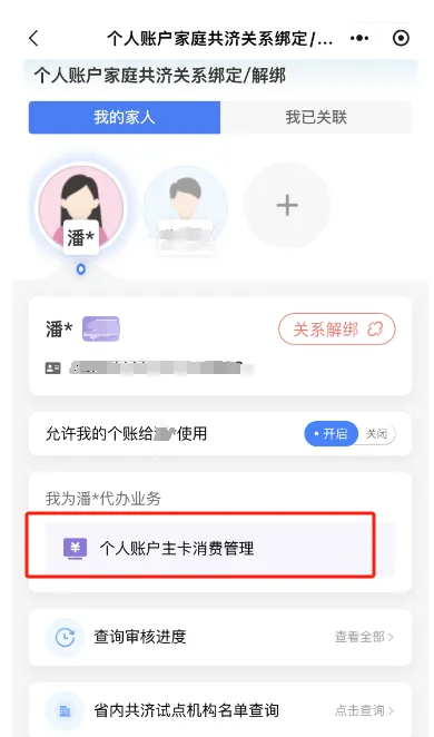 参保人作为授权人与家属办理了家庭通道绑定业务的,可通过家庭通道绑定功能为其家属设定个人账户消费主卡。