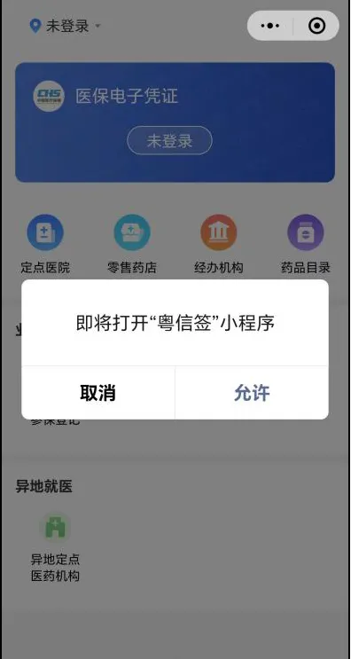 微信打开“粤医保”小程序,点击【未登录】。系统提示即将打开“粤信签”小程序,选择【允许】,系统跳转“粤信签”小程序。参保人经过人脸识别认证登录后,点击【返回医保服务平台】,进入粤医保办事首页,选择参保区划为“深圳市”。