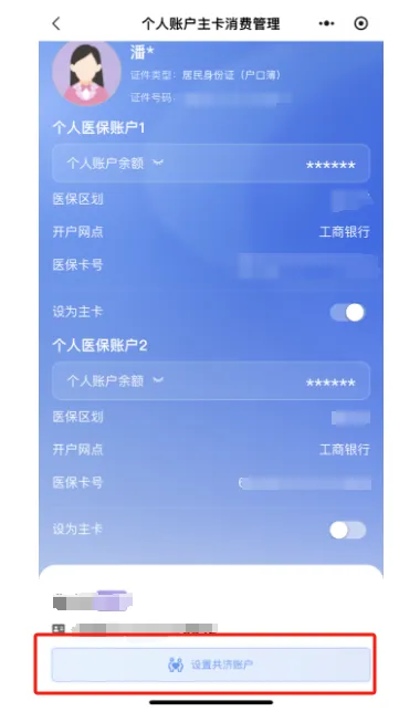 3.进入【个人账户主卡消费管理】设置界面,点击【设置共济账户】,选择【确定】即可办理成功。