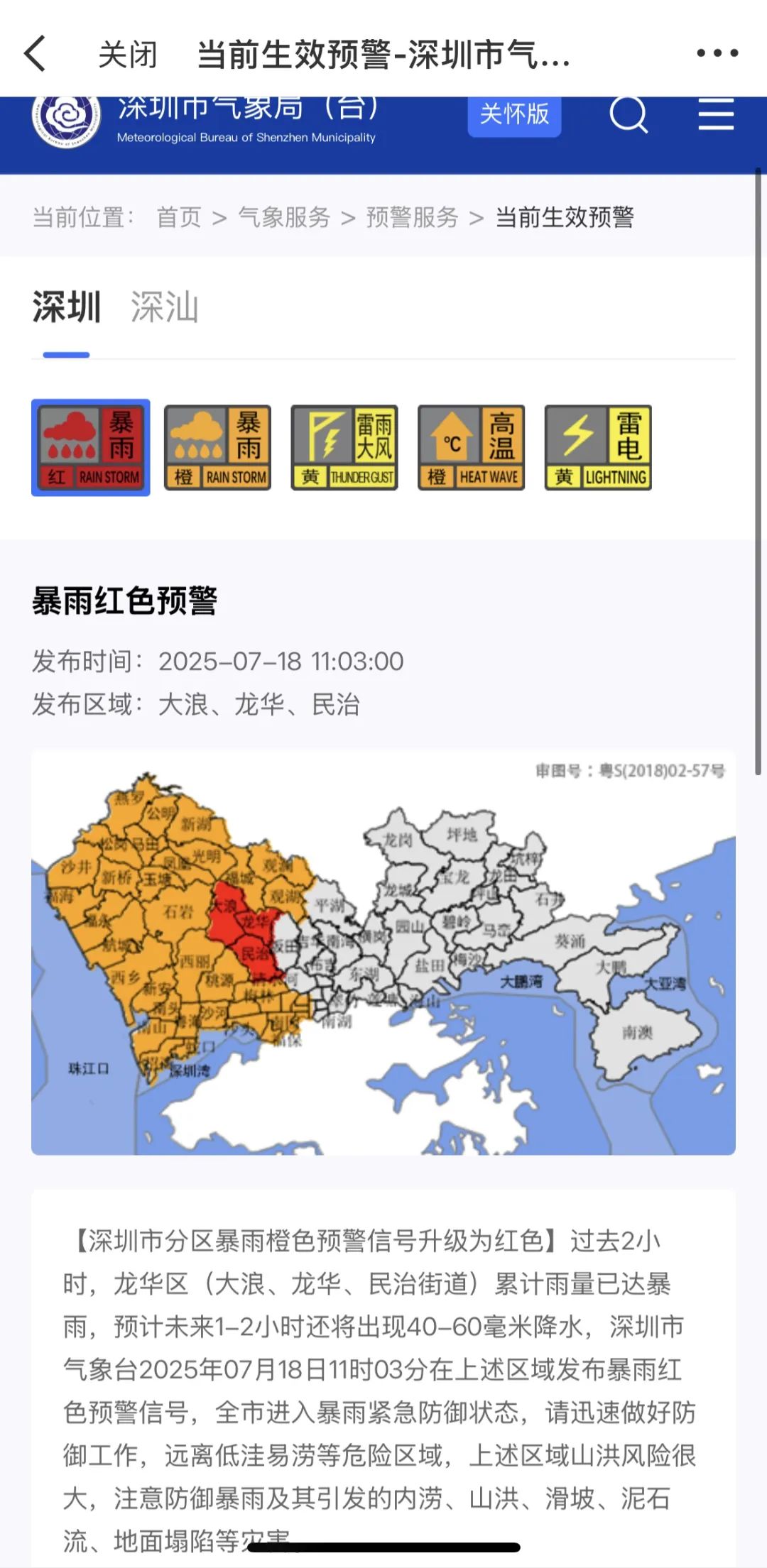 【深圳市分区暴雨橙色预警信号升级为红色】过去2小时,龙华区(大浪、龙华、民治街道)累计雨量已达暴雨,预计未来1-2小时还将出现40-60毫米降水,深圳市气象台2025年07月18日11时03分在上述区域发布暴雨红色预警信号,全市进入暴雨紧急防御状态,请迅速做好防御工作,远离低洼易涝等危险区域,上述区域山洪风险很大,注意防御暴雨及其引发的内涝、山洪、滑坡、泥石流、地面塌陷等灾害。