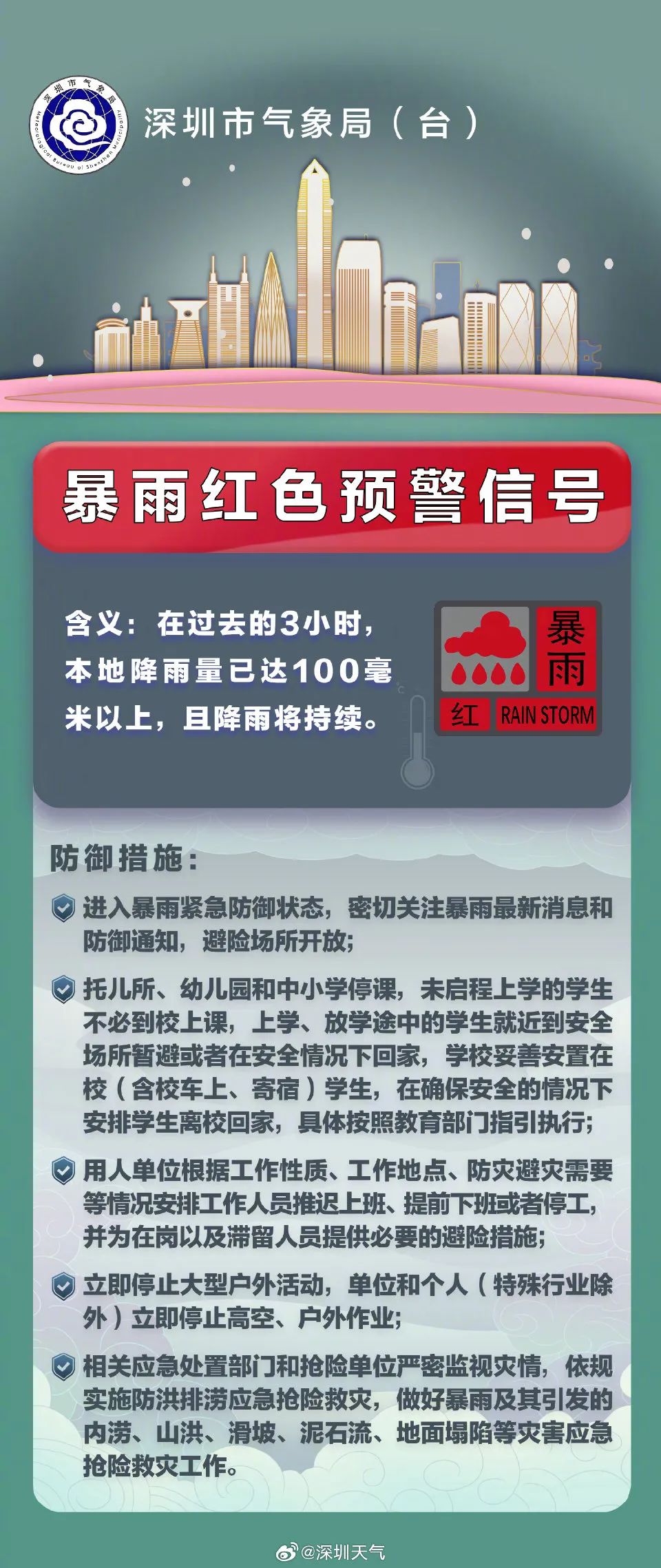 【深圳市分区暴雨黄色预警信号升级为橙色】过去3小时,南山区、福田区、宝安区、光明区和龙华区累计雨量已达暴雨,预计未来1-2小时还将出现30-40毫米降水,深圳市气象台2025年07月18日10时48分在上述区域发布暴雨橙色预警信号,全市进入暴雨防御状态,请远离低洼易涝等危险区域,上述区域山洪风险较大,注意防御暴雨可能引发的局部内涝、山洪、滑坡、泥石流等灾害。