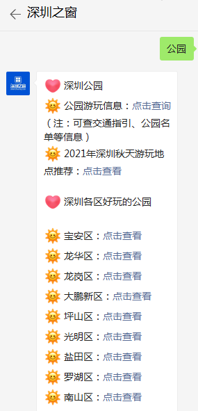 微信搜索或扫描文末二维码,关注【深圳之窗】公众号,对话框发送关键词【公园】即可获取深圳各区好玩的公园推荐。对话框发送关键词【旅游】即可获取深圳旅游攻略,