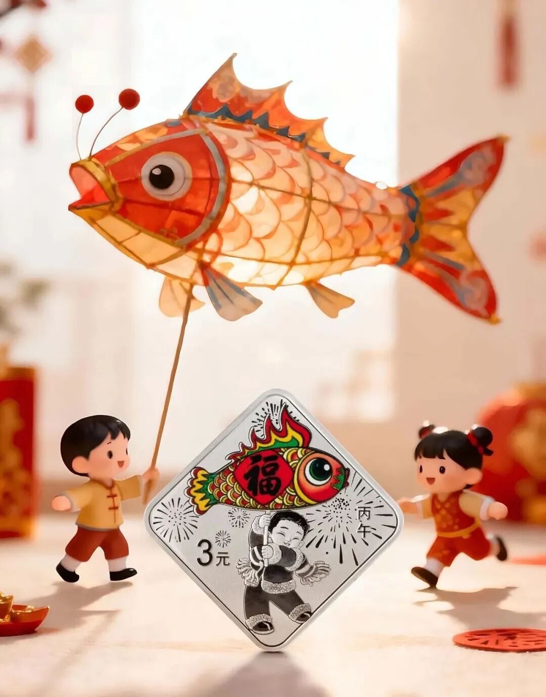 整体工艺通过分区处理,清晰划分画面层次,既突出“小孩举鱼灯”的核心场景,又使“祈福”主题在纪念币工艺的碰撞中更显鲜活,让纪念币具备了喜庆氛围与年味辨识度。