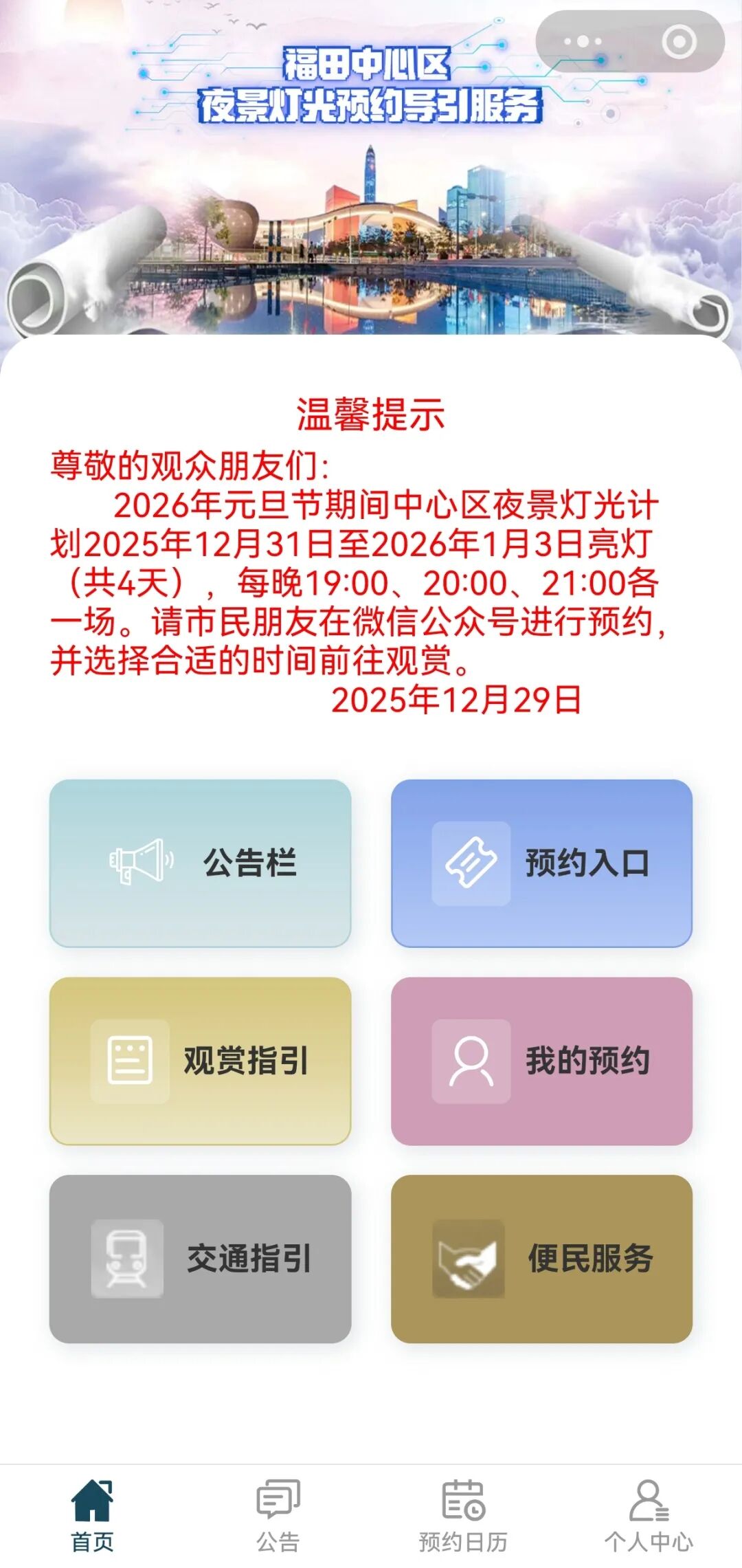据“福田中心区夜景灯光预约导引服务”最新公告,2026年元旦节期间中心区夜景灯光计划2025年12月31日至2026年1月3日亮灯(共4天),每天19:00、20:00、21:00各一场。