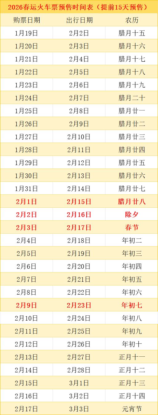 返乡高峰票:2月1日可以抢2月15日(腊月廿八)车票;2月2日可抢购2月16日(除夕)车票;2月3日可抢购2月17日(正月初一)车票;