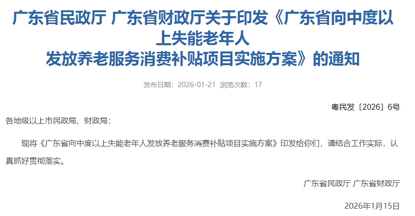 近日,广东省民政厅、省财政厅联合印发《广东省向中度以上失能老年人发放养老服务消费补贴项目实施方案》。根据方案,广东将为符合条件的失能老年人发放电子消费券每人每月最高可抵扣800元。