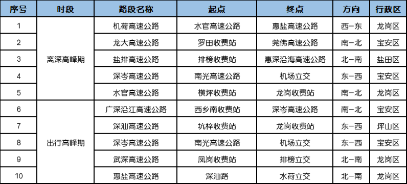 如机荷高速公路(水官高速公路-惠盐高速公路)、龙大高速公路(罗田收费站-莞佛高速公路)、盐排高速公路(排榜收费站 -惠深沿海高速公路)等部分路段。
