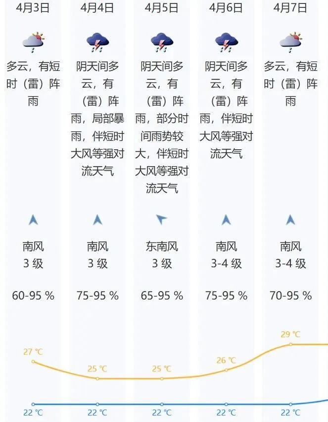 ▸预计3日多云,有短时雷阵雨,气温22-27℃。
