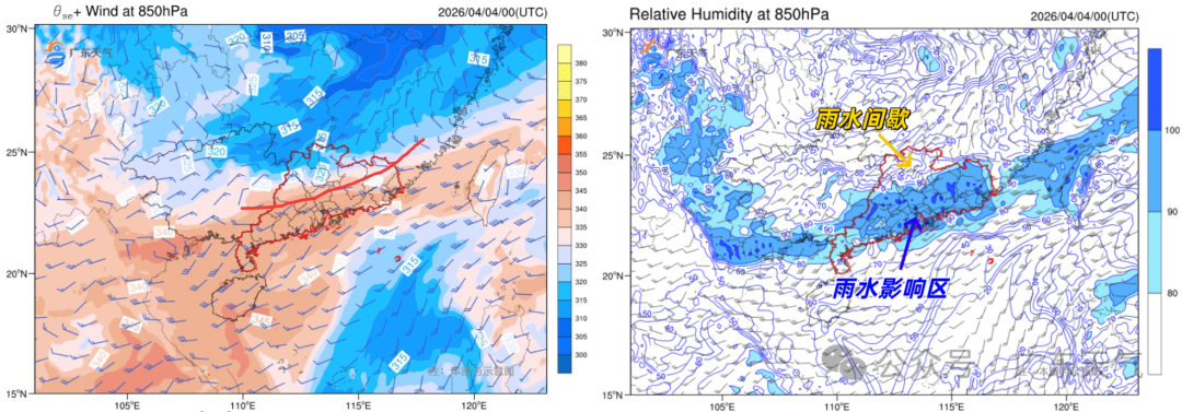 4日(清明假期第一天),南支槽东移,引导弱冷空气南下,切变线南压至广东省南部,南部湿层深厚,动力和不稳定能量条件有利,有明显的强对流过程,而中北部受冷空气影响,白天将进入降水的间歇期。