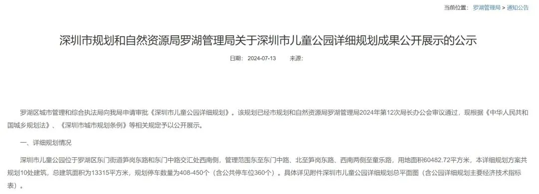 2024年,深圳市规划和自然资源局罗湖管理局发布关于深圳市儿童公园详细规划成果公开展示的公示。