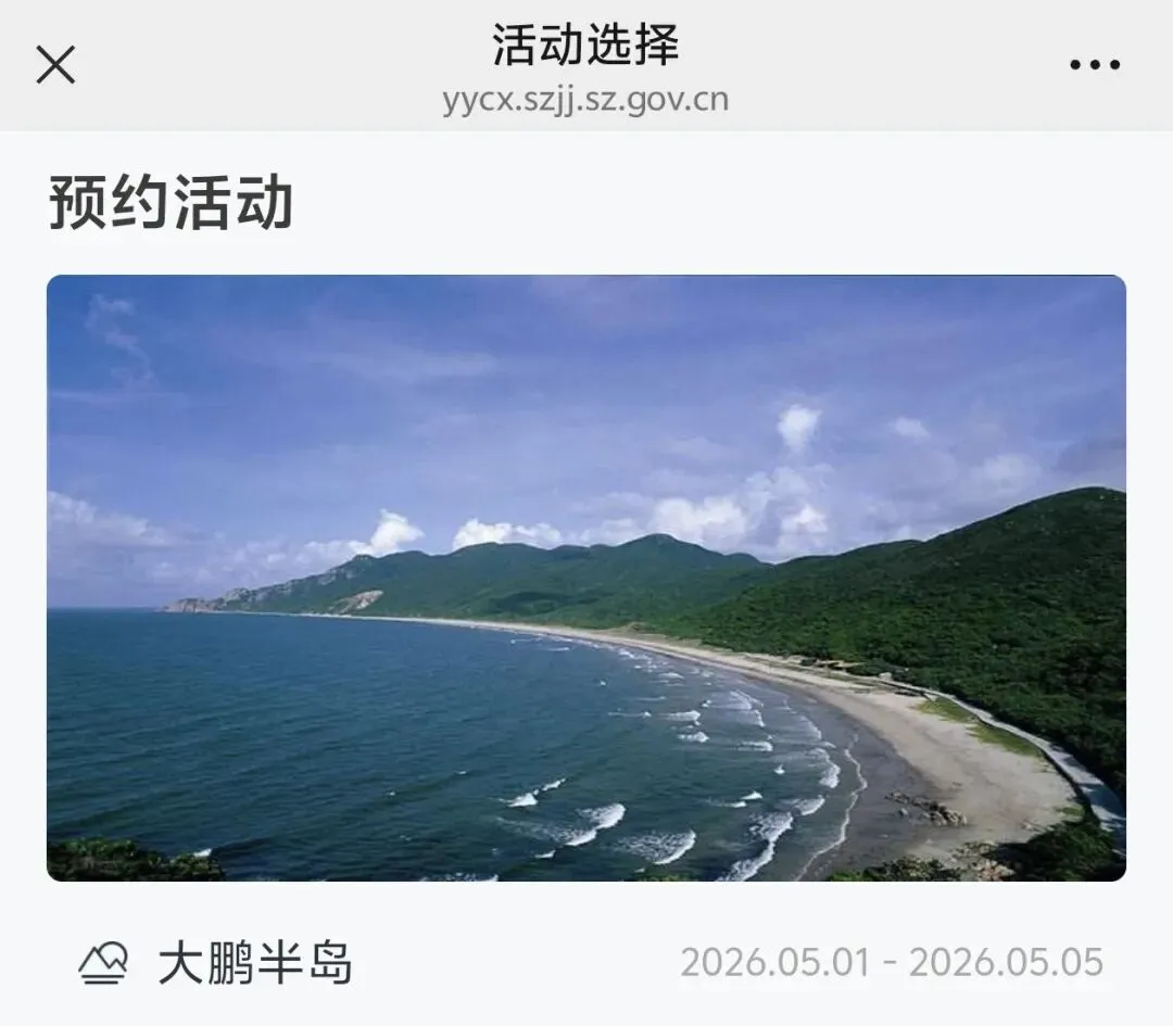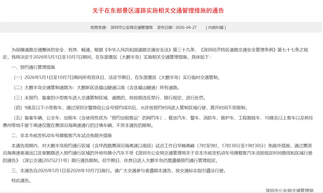 一、2026年5月1日至10月7日期间所有双休日、法定节假日,在东部景区(大鹏半岛)实行临时交通管制。