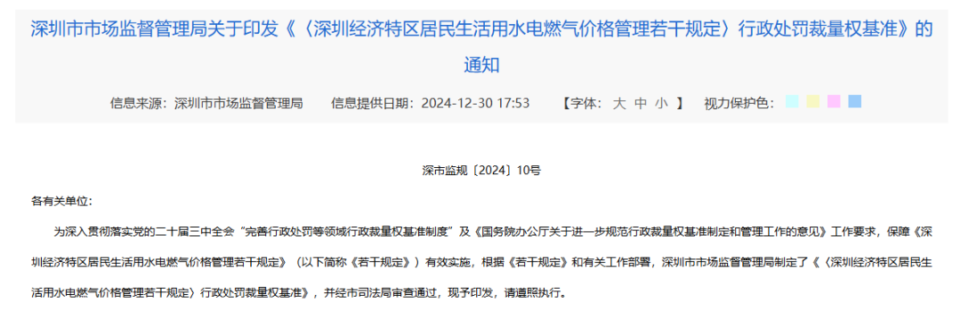 2024年12月30日,深圳市市场监管局制定并印发《〈深圳经济特区居民生活用水电燃气价格管理若干规定〉行政处罚裁量权基准》,进一步细化处罚阶次、强化执法标准。
