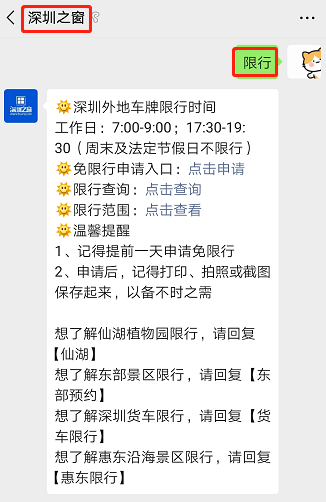 微信搜索关注【深圳之窗】公众号,对话框发送关键词【限行】可查看深圳最新限行消息,并查看深圳外地车免限行申请入口。