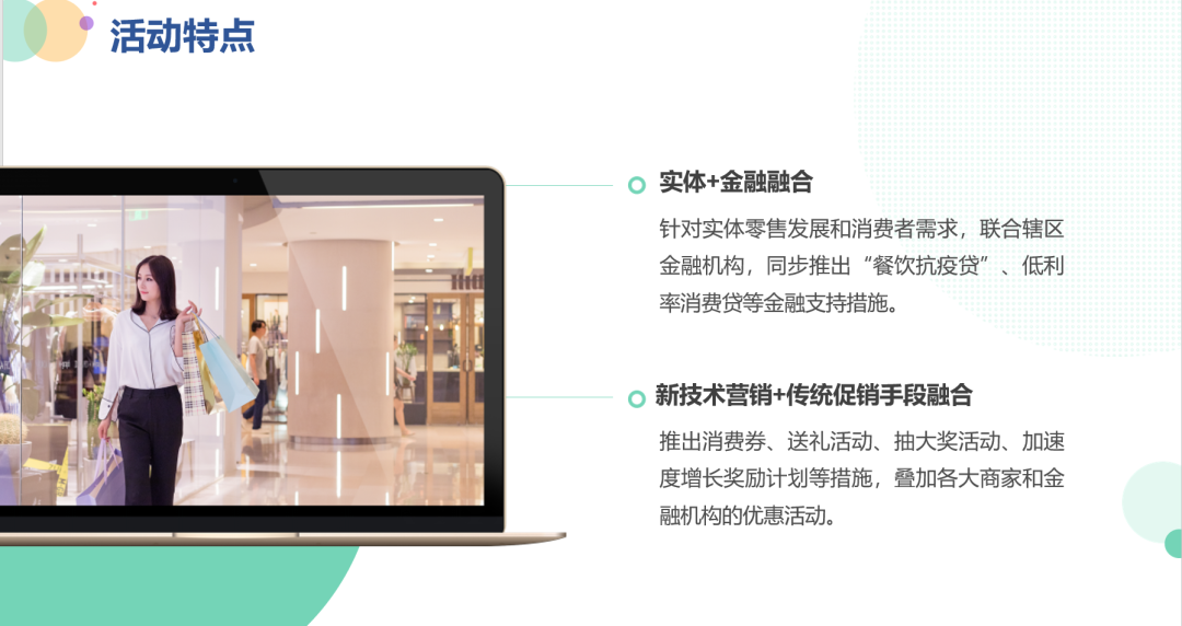 活动通过“线上+线下、商圈+行业、实体+金融、新技术营销+传统促销手段”四维融合,异业联动、金融助力,恢复信心、集聚人气、享受实惠、促进消费。