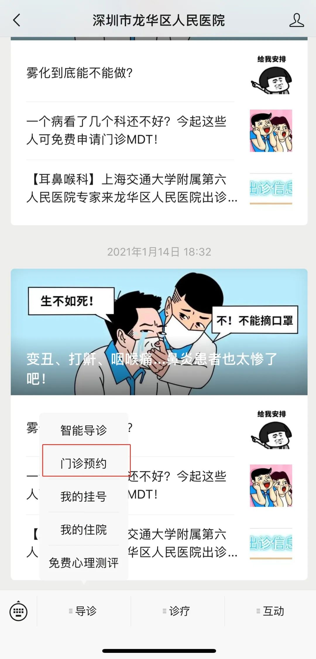 1、关注公众号,点击“导诊”—“门诊预约”