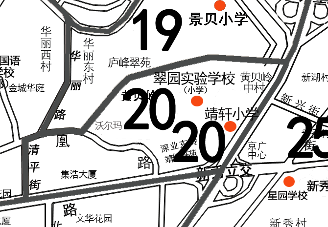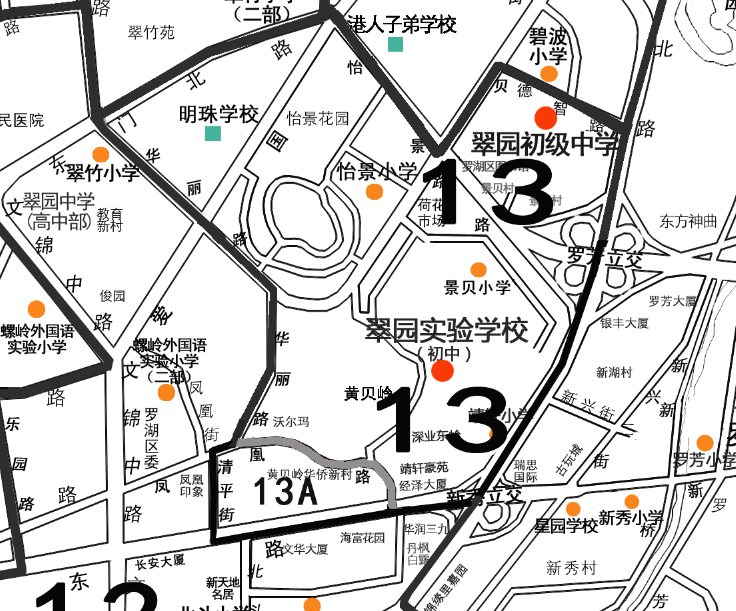 (2)根据翠园实验学校的建设规模,将属于翠园实验学校小学部招生范围的凤凰路以南、清平路以东,深南东路以北区域(即13A)划入翠园实验学校初中部的招生范围(但不属于翠园初级中学招生范围)。