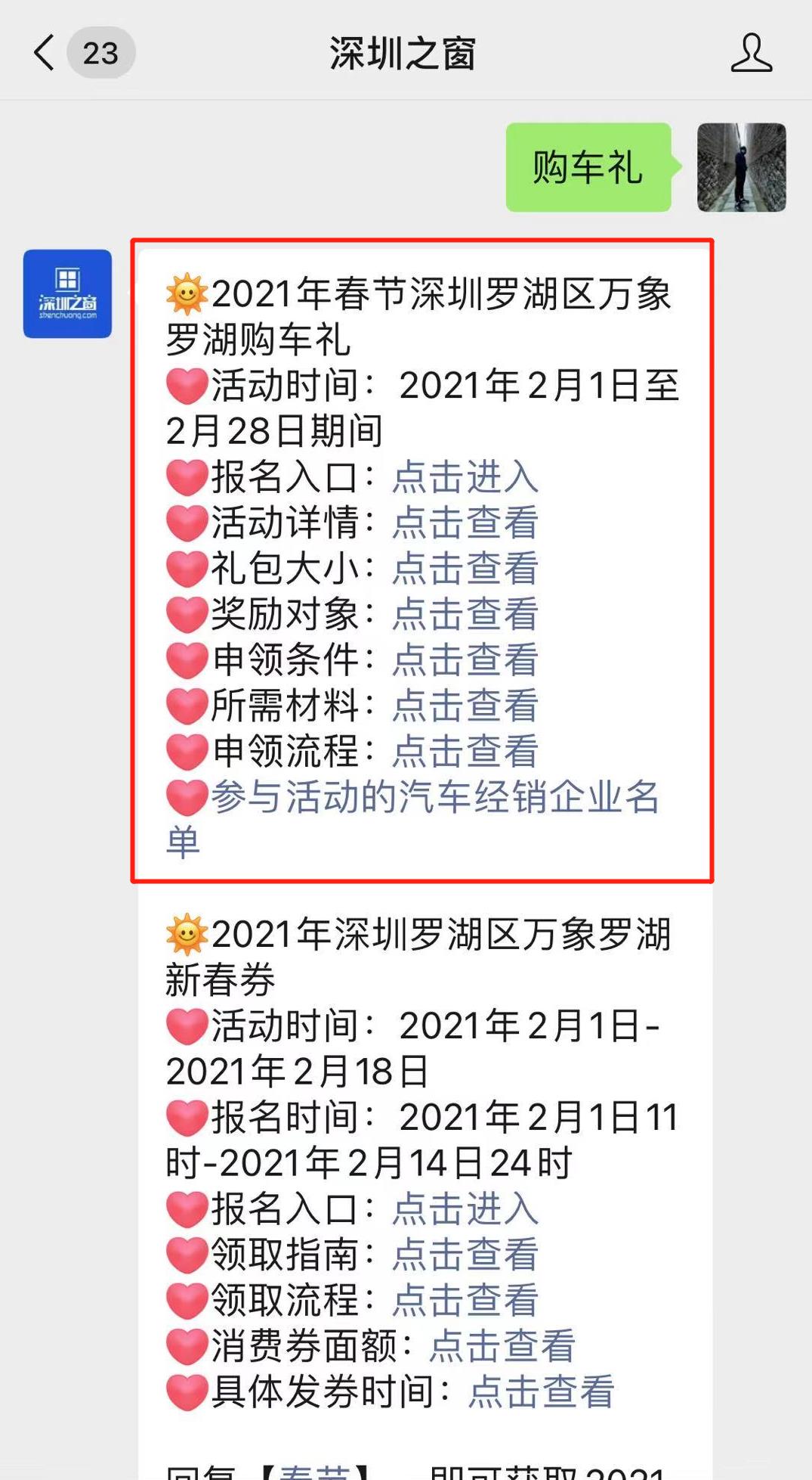 搜索或扫描文末二维码,关注【深圳之窗】微信公众号,回复关键词【购车礼】,获取2021年春节深圳罗湖区万象罗湖购车礼报名入口及最新消息。