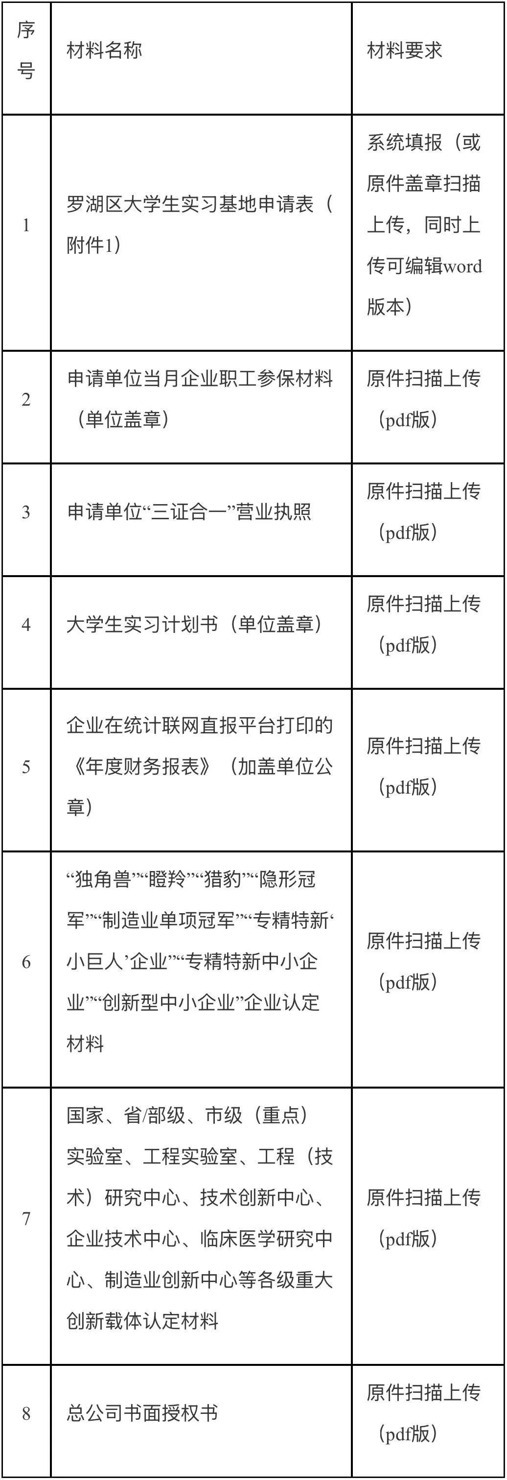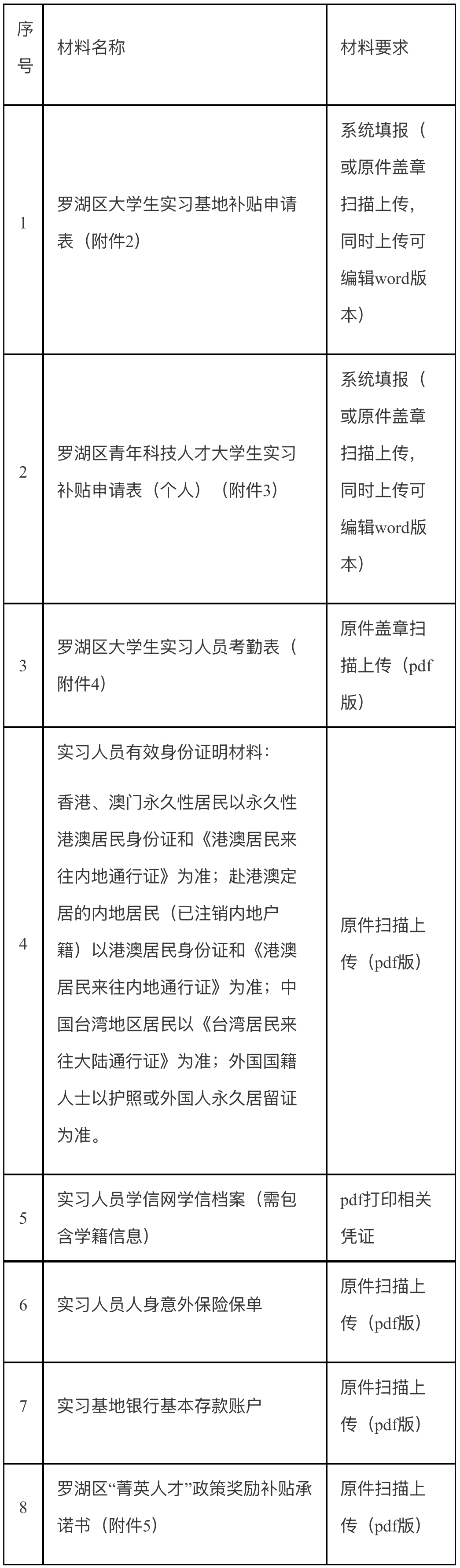 备注:《罗湖区青年科技人才大学生实习补贴申请表(个人)》(附件3)须附带《罗湖区大学生实习基地申请表》(附件1),一并提交。青年科技人才是指在罗湖区软信和人工智能、生命健康、低空与空天企业认定实习基地的紧缺岗位上实习的人员。