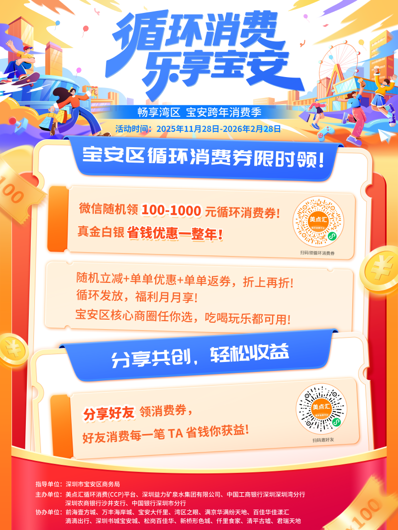 为积极响应中央、省、市关于提振消费、扩大内需的号召,继新桥街道率先试点启动年度循环消费活动后,在宝安区商务局的指导下,美点汇平台联合多方力量,重磅推出“畅享湾区·宝安跨年消费季”重点活动——“循环消费·乐享宝安”年度循环消费活动。