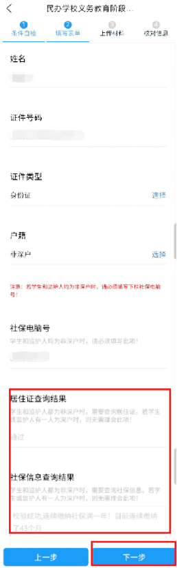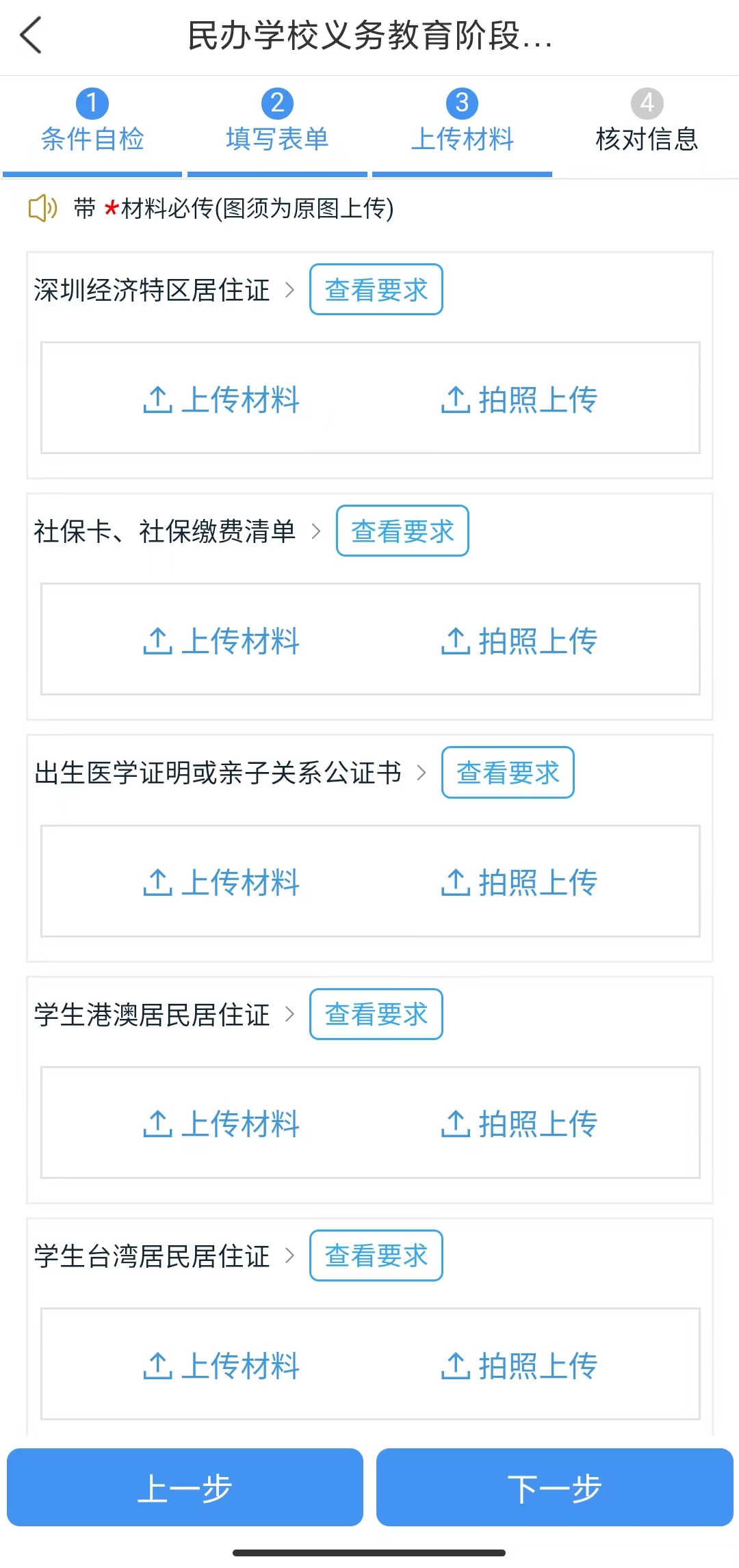 在【填写表单】页面将要申请的学生信息和监护人信息等必填项填写完成后,点击“下一步”按钮,进入【上传材料】页面。(注意:若家长为非白名单人员,系统会提示需要填写社保电脑号及居住证号,若不通过,则系统进入人工审批,无需重复申请)