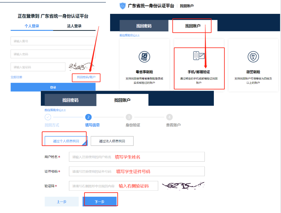 进入广东省政务服务网,点击页面右上角“登录”- 其他登录方式“账号密码” - “找回密码/账户”,选择“找回账户”或“找回密码” - “手机/邮箱验证”,具体操作如下图: