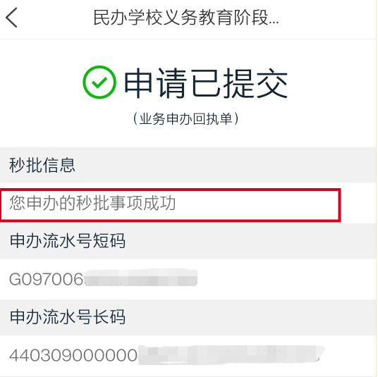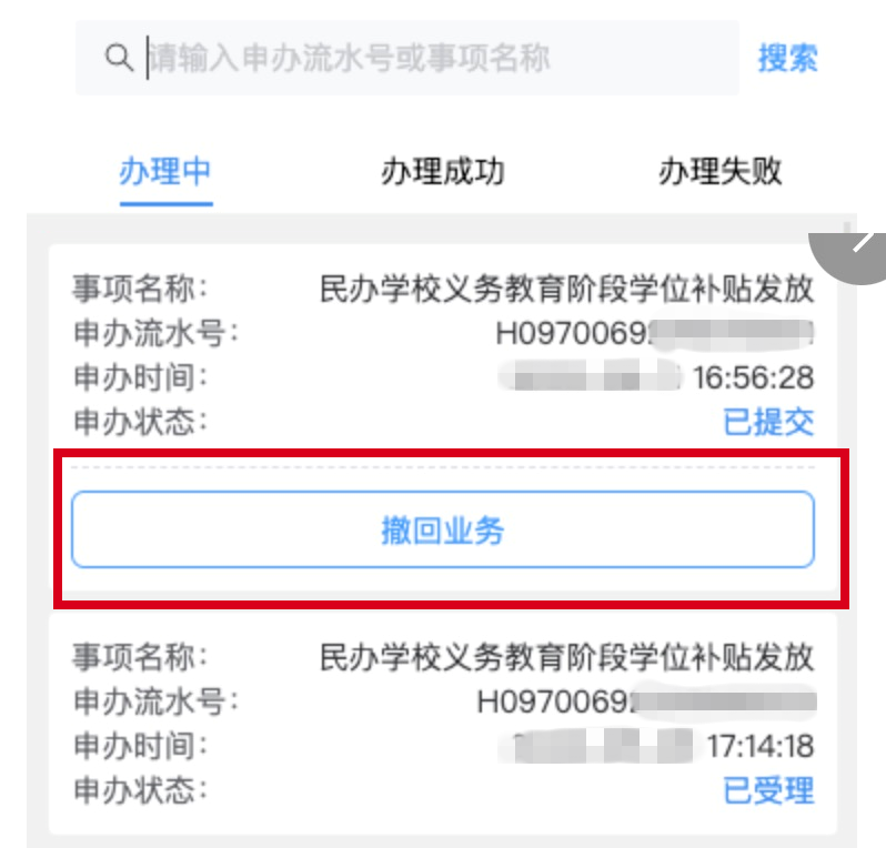 若秒批没成功,先在“办理中”栏目中进行业务查看,并联系学校查询原因,等待学校解决后通知家长,再点击业务撤回,重新申办业务即可。