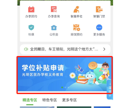 在光明区门户页面内选择特色专区里“教育服务专区”主题。