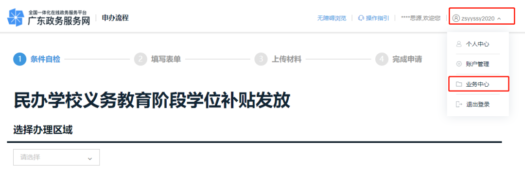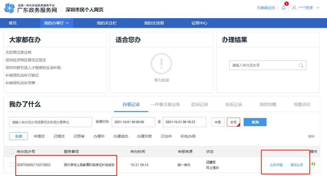 在申办页面右上角点击账号下拉菜单“业务中心”,可查看已提交申请的“业务详情”进行“撤回业务”操作。