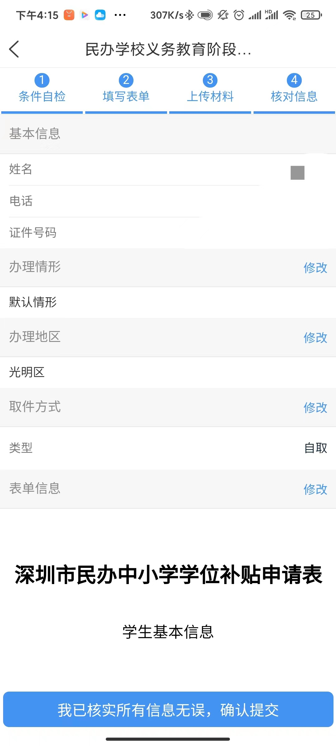 在【上传材料】页面,系统自动带出材料,家长可点击“下一步”按钮,进入【核对信息】页面。
