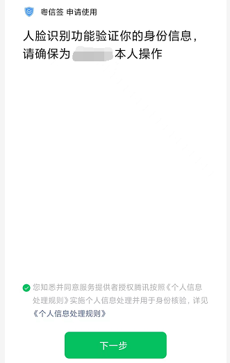勾选“您知悉并同意服务提供者授权腾讯按照《个人信息处理规则》实施个人信息处理并用于身份核验,详见《个人信息处理规则》”,然后点击“下一步”按钮,进行人脸核验。